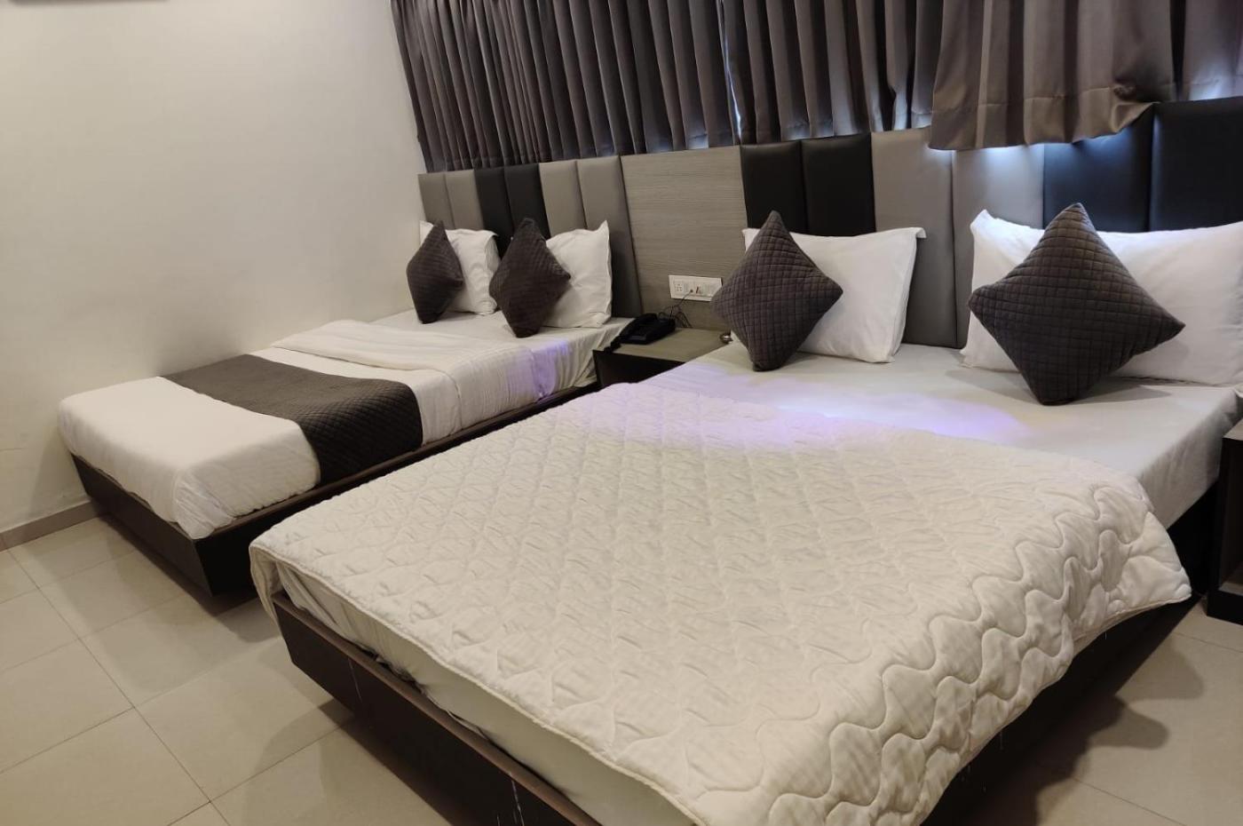 Hotel Selfie Inn in Ahmedabad offers family rooms with air-conditioning, private bathrooms, and modern amenities. Each room includes a balcony or terrace with city views, a kitchen, and a work desk.